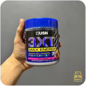 محصولی که در تصویر مشاهده میکنید، مکمل قبل از تمرین (Pre-Workout) با نام 3XT Max Energy از برند USN است. این مکمل با فرمولاسیون “تحریککننده قوی و ترموژنیک (High Stimulant & Thermogenic)” طراحی شده است تا سطح بالایی از انرژی، تمرکز ذهنی، پمپ عضلانی و حمایت از چربیسوزی را قبل از شروع تمرینات سخت فراهم کند.
