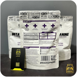 محصولی که در تصویر مشاهده میکنید، مکمل بتا آلانین (Beta Alanine) از برند DNA Sports است. بتا آلانین یک آمینو اسید غیرضروری است که برای سنتز کارنوزین در عضلات اسکلتی مورد استفاده قرار میگیرد. کارنوزین به عنوان یک بافر عمل میکند و به کاهش تجمع اسید لاکتیک در حین تمرینات شدید کمک میکند، در نتیجه خستگی عضلانی به تأخیر میافتد و عملکرد ورزشی بهبود مییابد.